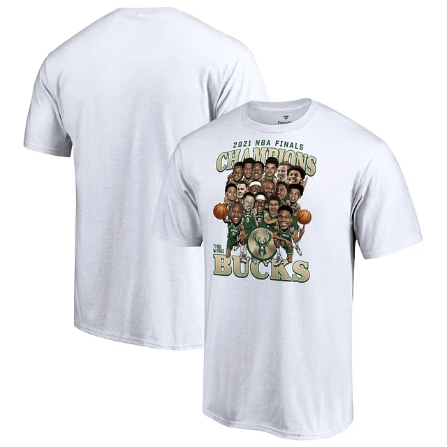 Men's Fanatics White Milwaukee Bucks 2021 NBA Finals Champions Team Caricature Roster T-Shirt