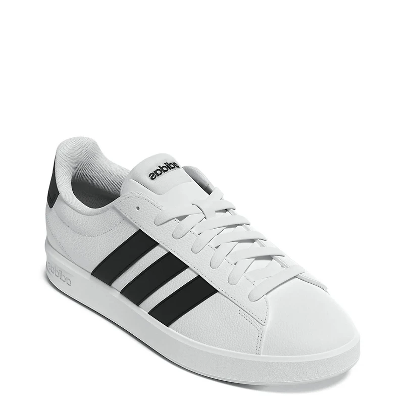 These men's Adidas Grand Court 3.0 athletic sneakers blend heritage and comfort for everyday wear. These wide-width sneakers have an upper that combines durable leather and textile materials for a sleek, street-ready look. The lace closure ensures a secure, adjustable fit. A classic low-cut design adds versatility. CLOUDFOAM technology delivers soft, responsive cushioning with every step, supported by a plush footbed and smooth sock construction. A lightweight midsole enhances comfort and the high-abrasion rubber outsole provides reliable traction across urban surfaces. Made in part with recycled materials, these shoes offer sustainable wear.