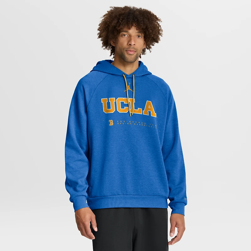 No matter the weather, stay comfortable in this UCLA Bruins 2025 Courtside Basketball Practice Raglan Dri-FIT Hoodie by Jordan Brand. The blended material features sweat-wicking technology to keep you dry, protection against the sun's harmful rays and raglan sleeves for flexible movement. An adjustable hood lets you customize coverage, while the pouch pocket provides easy access to essentials carried around in this UCLA Bruins hoodie.