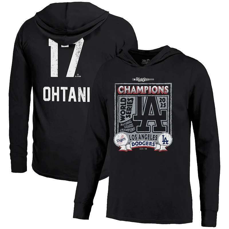 Men's Majestic Threads Shohei Ohtani Black Los Angeles Dodgers 2025 World Series Champions Name & Number Lightweight Hoodie