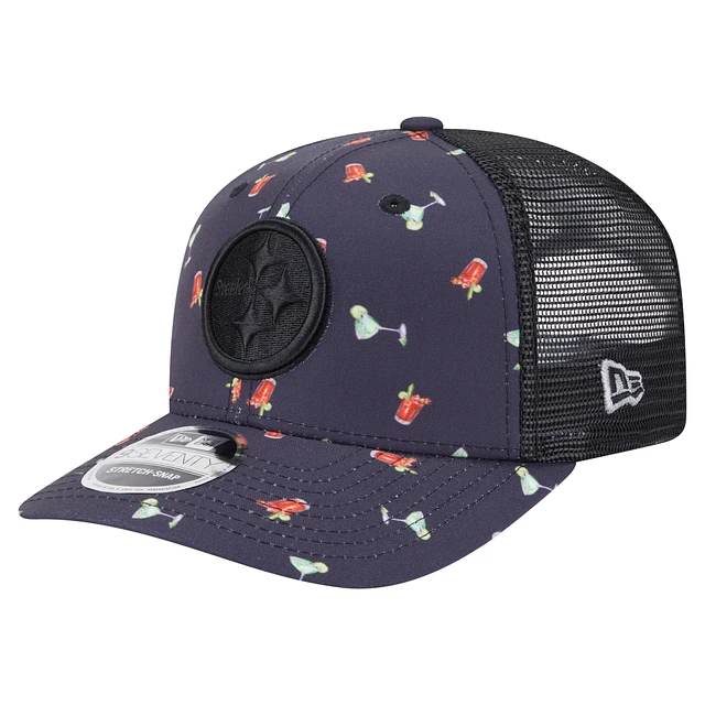 Men's New Era Navy/Black Pittsburgh Steelers Adventure Drinks Pattern 9SEVENTY Stretch-Snap Hat