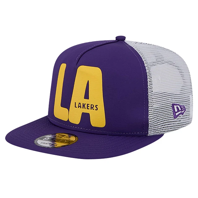 Men's New Era Purple Los Angeles Lakers Puff Print Team Code A-Frame 9FIFTY Trucker Snapback Hat