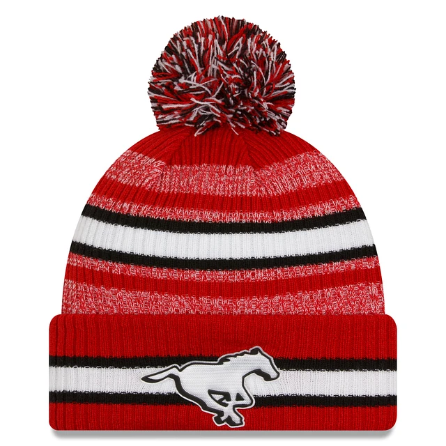 Men's New Era Red Calgary Stampeders Sideline 6 Dart Cuffed Knit Hat with Pom