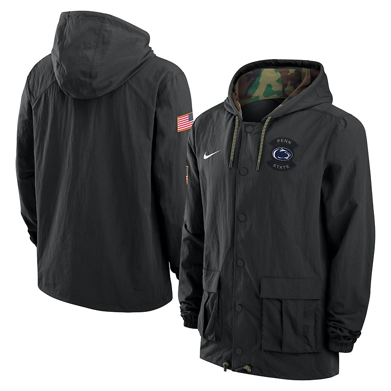 Proudly support the Penn State Nittany Lions in this 2025 NCAA Military Appreciation Full-Snap Jacket by Nike. It's crafted from water-resistant recycled nylon to ensure you stay dry and comfortable on rainy days. The drawstring hem allows for a customizable fit, while a camo-lined hood and elastic cuffs give you added coverage from the elements in this Penn State Nittany Lions jacket.