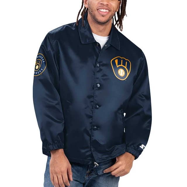 Men's Starter Navy Milwaukee Brewers Option Route Satin Full-Snap Jacket