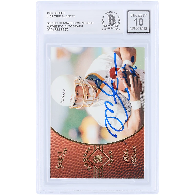 Elevate your collection of Tampa Bay Buccaneers memorabilia by picking up this Mike Alstott autographed 1996 Pinnacle Select #158 Beckett Fanatics Witnessed Authenticated 10 Rookie Card. Encapsulated in a tamper-proof acrylic case, this collectible features a striking signature from the Tampa Bay Buccaneers star to make it a must have addition for any die-hard fan or serious collector.