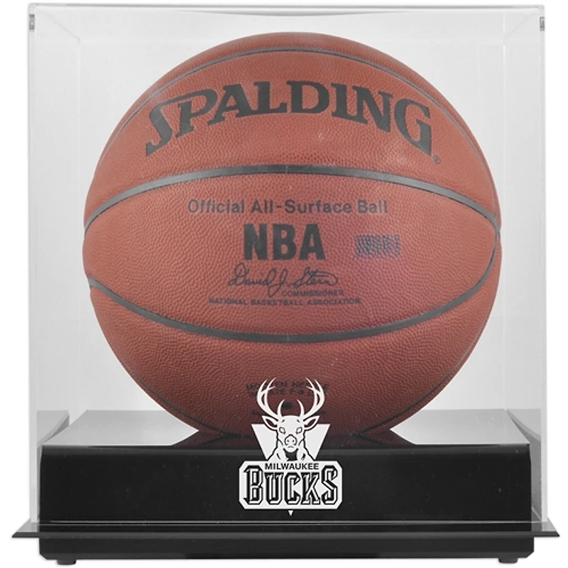 The Milwaukee Bucks black base logo basketball display case is made of 1/8" thick acrylic. It features a clear acrylic removable lid with mirrored back and engraved team logo. The product is officially licensed by the National Basketball Association and is perfect for a collectible basketball. Measures 13" x 11 1/4" x 11 1/2". Memorabilia sold separately.