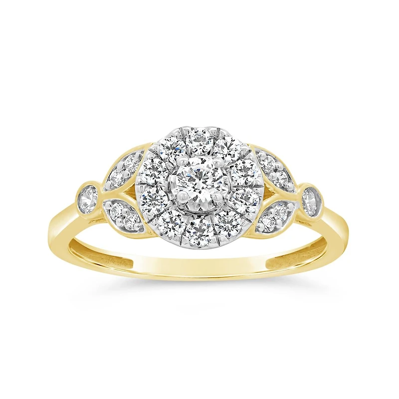Delicate floral accents bring a romantic touch to this Lab Grown 0.50CTW Diamond Fashion Ring in 10K Yellow Gold. A shimmering round centre stone is encircled by a radiant halo, enhancing its brilliance, while the intricate details add charm and elegance to this beautifully designed piece.