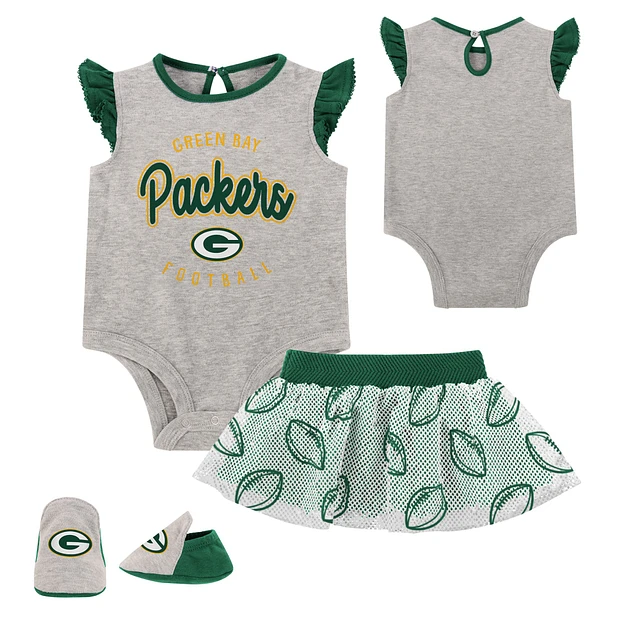Newborn Heather Gray/Green Green Bay Packers All Dolled Up Three-Piece Bodysuit, Skirt & Booties Set