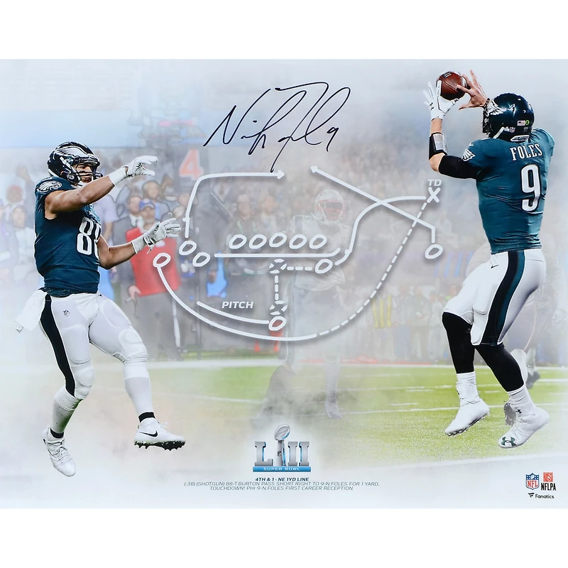 The Philadelphia Eagles were facing a fourth-and-goal from the 1-yard line late in the second quarter. Foles faked like he was calling an audible and center Jason Kelce sent a direct snap to rookie running back Corey Clement, who flipped it to tight end Trey Burton on a reverse. Foles darted out into the flat and Burton found him in the end zone, upping the Eagles' lead to 22-12 at the half. This 16" x 20" photograph has been personally hand-signed by Nick Foles. It is officially licensed by the National Football League and comes with an individually numbered, tamper-evident hologram from Fanatics Authentic. To ensure authenticity, the hologram can be reviewed online. This process helps to ensure that the product purchased is authentic and eliminates any possibility of duplication or fraud.