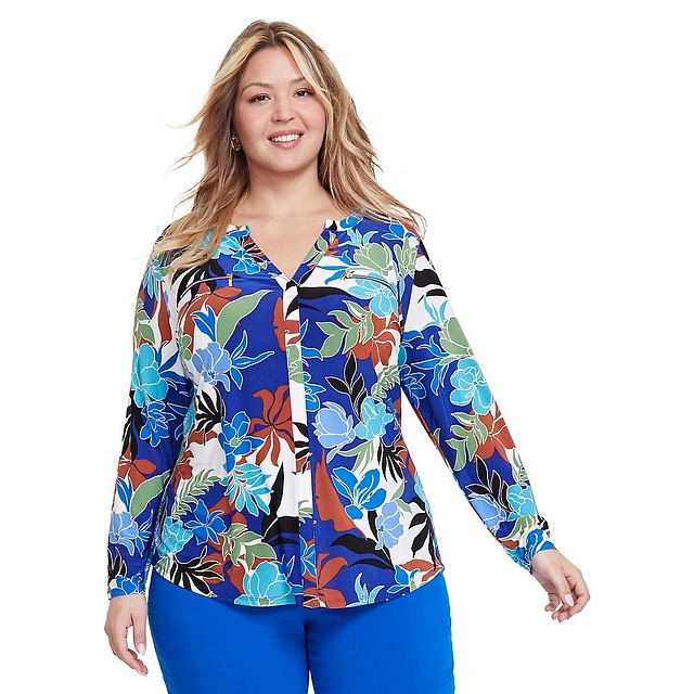 Plus Floral-Print Long-Sleeve Zip-Pocket V-Neck Top