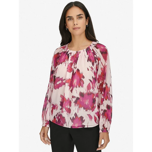 Printed Shirred-Neckline Keyhole Blouse
