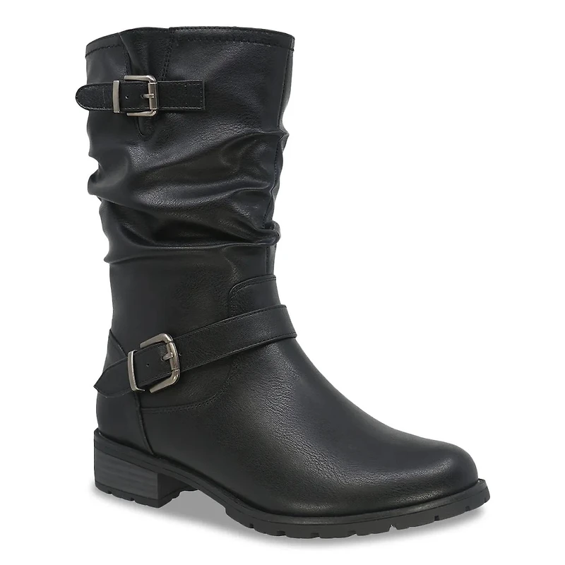 Get ready for winter adventures with these women's Taxi Queens black wide width winter boots. Made of faux leather upper with a waterproof seam-sealed membrane to help keep feet dry, these mid-calf cold weather boots have a round toe and an inside zipper closure. Two decorative buckles and the slouchy finish on the upper add a refined look. The heavy faux fur lining and a soft padded insole with short faux fur lined sockliner offer a comfy cozy feel and exceptional cushioned support and. A TPR rubber lugged outsole and block heel ensure stable footing.