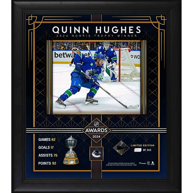 Quinn Hughes Vancouver Canucks Framed 2024 Norris Trophy Winner 15" x 17" Photograph with a Piece of Game-Used Puck - Limited Edition of 343