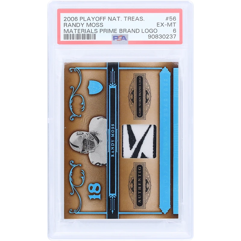 This Randy Moss Oakland Raiders 2006 Playoff National Treasures GU Reebok Relic #56 #7/10 PSA Authenticated 6 Card is ready to help you display your NFL fandom. Encapsulated in a tamper-proof acrylic case for preservation, this striking card also showcases the Oakland Raiders star across the front with a 6 grade to make it the ultimate collector's item.