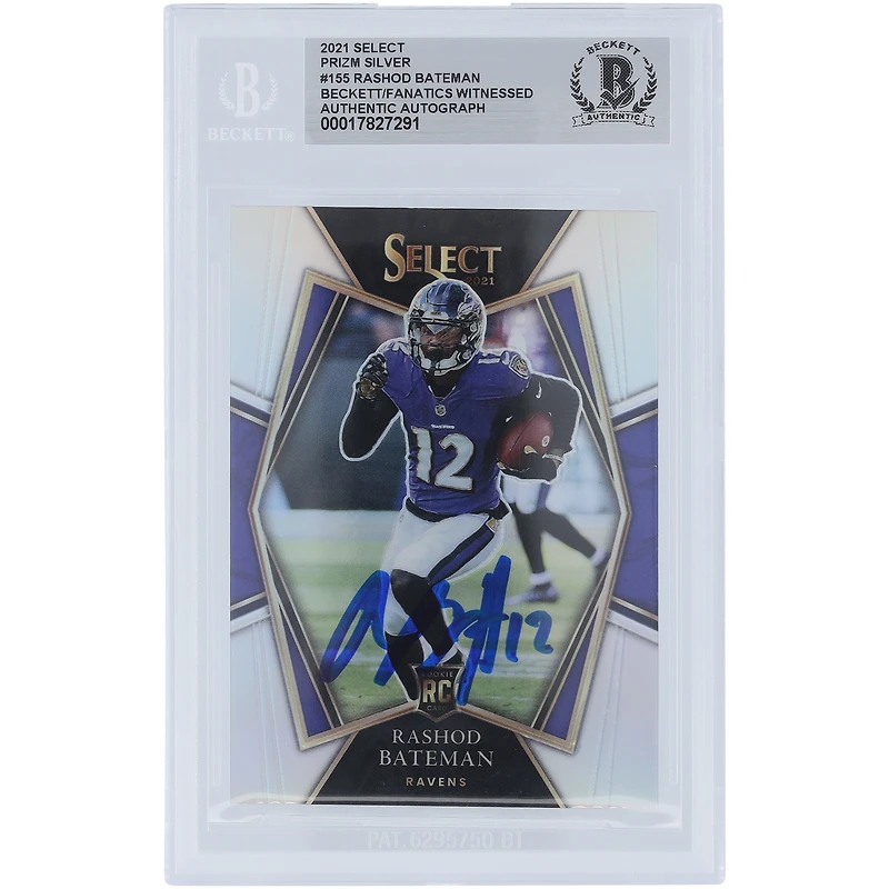 This Rashod Bateman Baltimore Ravens Autographed 2021 Panini Select Silver Prizm #155 Beckett Fanatics Witnessed Authenticated Rookie Card is ready to help you display your NFL fandom. Encapsulated in a tamper-proof acrylic case for preservation, this striking card also showcases the unique signature of Rashod Bateman to make it the ultimate collector's item.