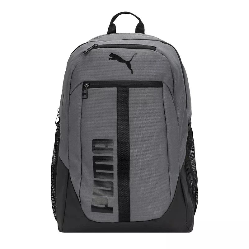 Pack your essentials in sleek style with this Puma Regenerate grey backpack. The polyester backpack, lined partially, has two zip around compartments for roomy storage. Mesh water bottle holders and front zippered sections add to the convenience, while 'PUMA' wordmark brings signature style. Adjustable shoulder straps and top webbing strap provide carrying convenience.
