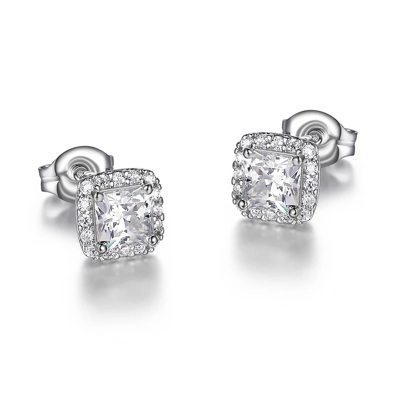 These earrings feature a striking square halo design, with a central stone surrounded by a ring of smaller stones that enhance its brilliance. The geometric shape adds a modern twist to the classic halo style, making these earrings a bold and elegant choice.