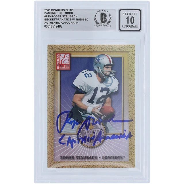 Roger Staubach Dallas Cowboys Autographed 2000 Donruss Elite Passing The Torch #PT-9 #/1500 Beckett Fanatics Witnessed Authenticated 10 Card with "Captain America" Inscription