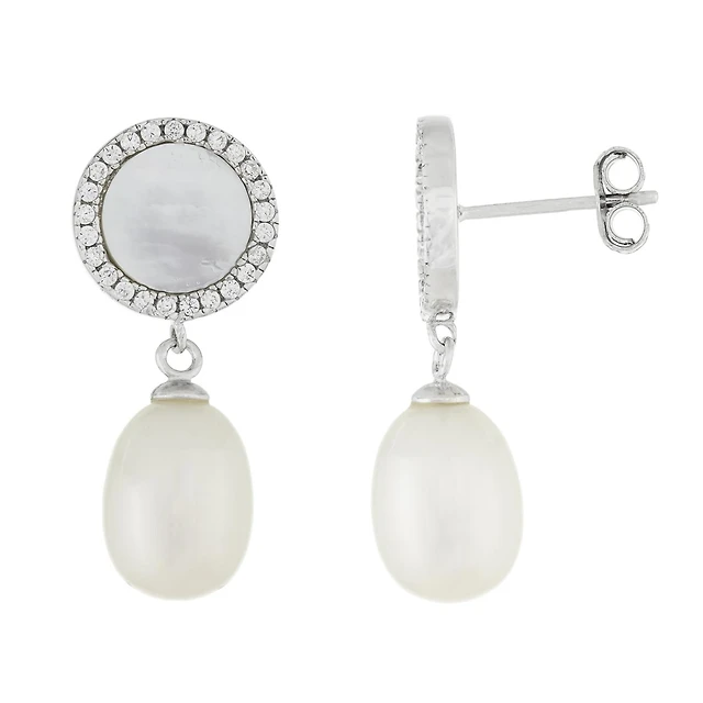 Sterling Silver 9-10mm Freshwater Pearls and 10mm Mother of Pearl Earrings