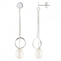 A pair of white dangling freshwater pearl double dangling chain earrings in sterling silver rhodium plated