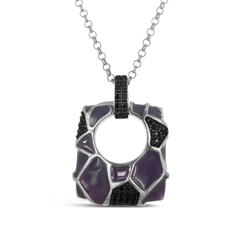 This striking sleek sterling silver pendant showcases round cut black onyx gemstones accented by violet enamel. Day or night - this pendant will always complete your look!