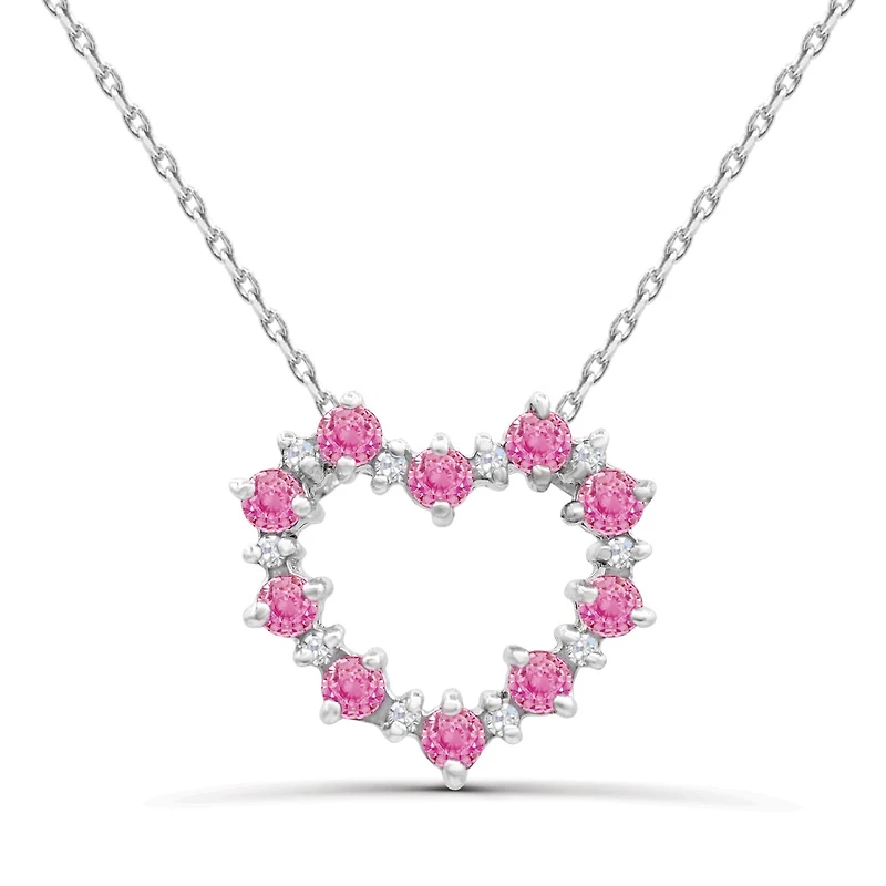 This beautiful sterling silver heart pendant will ensure you’re always pretty in pink. Created pink & created white sapphires alternate in a heart shape crafted in gleaming sterling silver. Buy this for yourself or for someone special in your life.
