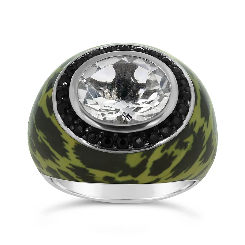 This striking sleek sterling silver ring showcases a large oval green quartz surrounded by gleaming black onyx and accented by black & green enamel.  Day or night - this ring will always complete your look!