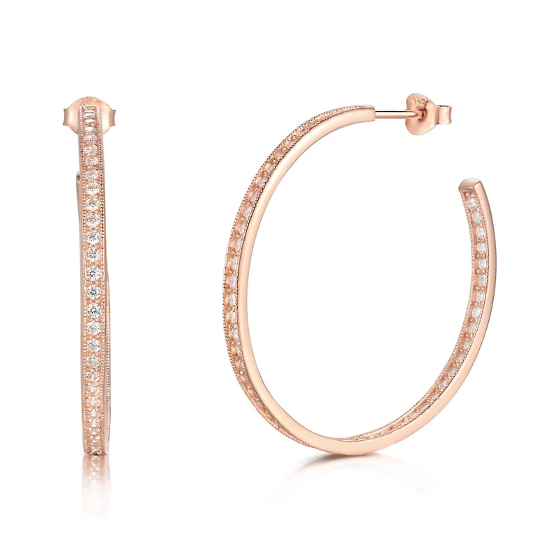 These earrings feature a classic hoop design with the added elegance of cubic zirconia stones set both inside and outside the hoops, creating a sparkling effect from every angle. Crafted from high-quality sterling silver and plated with a soft rose gold finish, these earrings exude sophistication and shine.