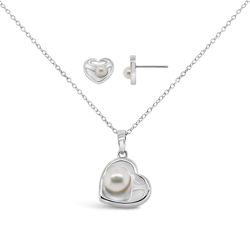 Sterling Silver White Freshwater Pearl Heart Shaped Pendant and Earrings