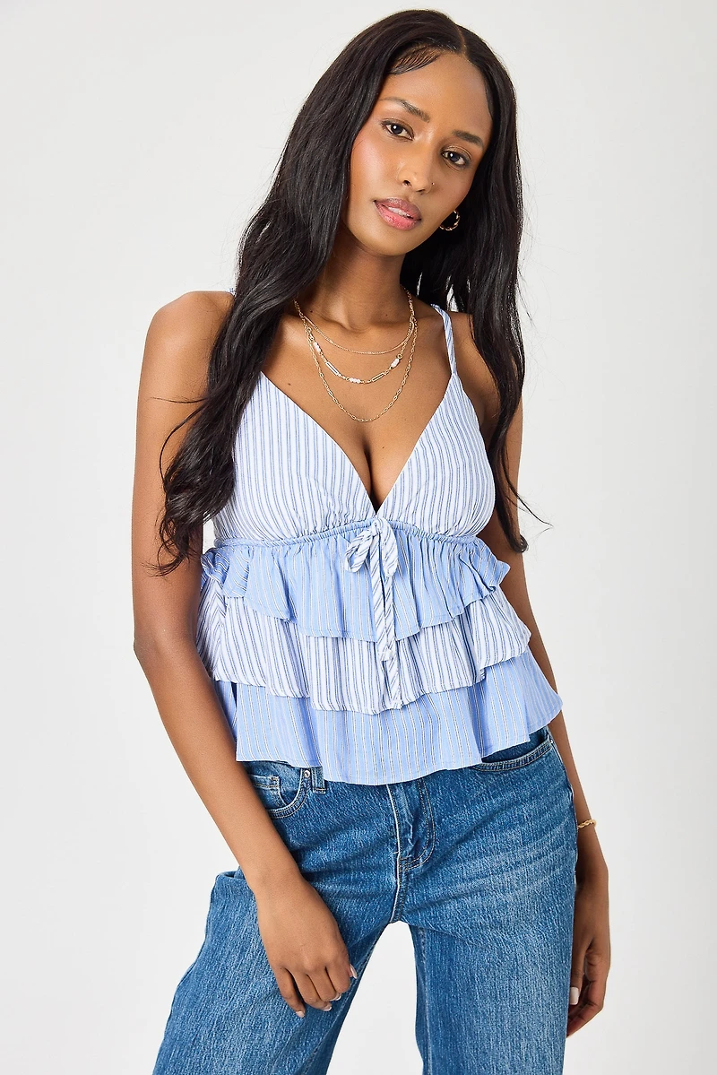 A breezy babydoll top with a stripe twin print and softly tiered silhouette. Finished with adjustable spaghetti straps, a V-neckline with front tie detail, and a smocked elastic back for added comfort.
