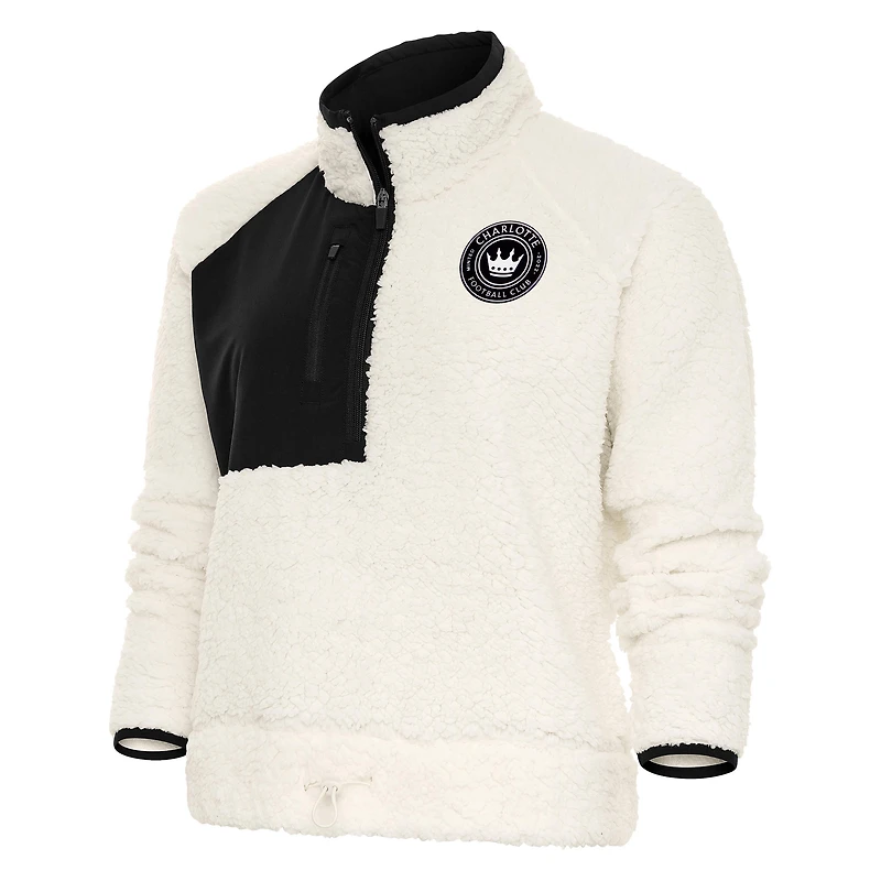 Represent your Charlotte FC pride with the Women's Antigua Cream Charlotte FC Brushed Metallic Logo Fusion Pullover. This Charlotte FC pullover features a half-zip design with a woven fabric overlap detail at the zipper chest pocket, and a cropped length with a bungee cord/toggle at the bottom hem. Whether you're cheering on Charlotte FC at the stadium or watching from home, this pullover is the perfect way to show your team spirit.