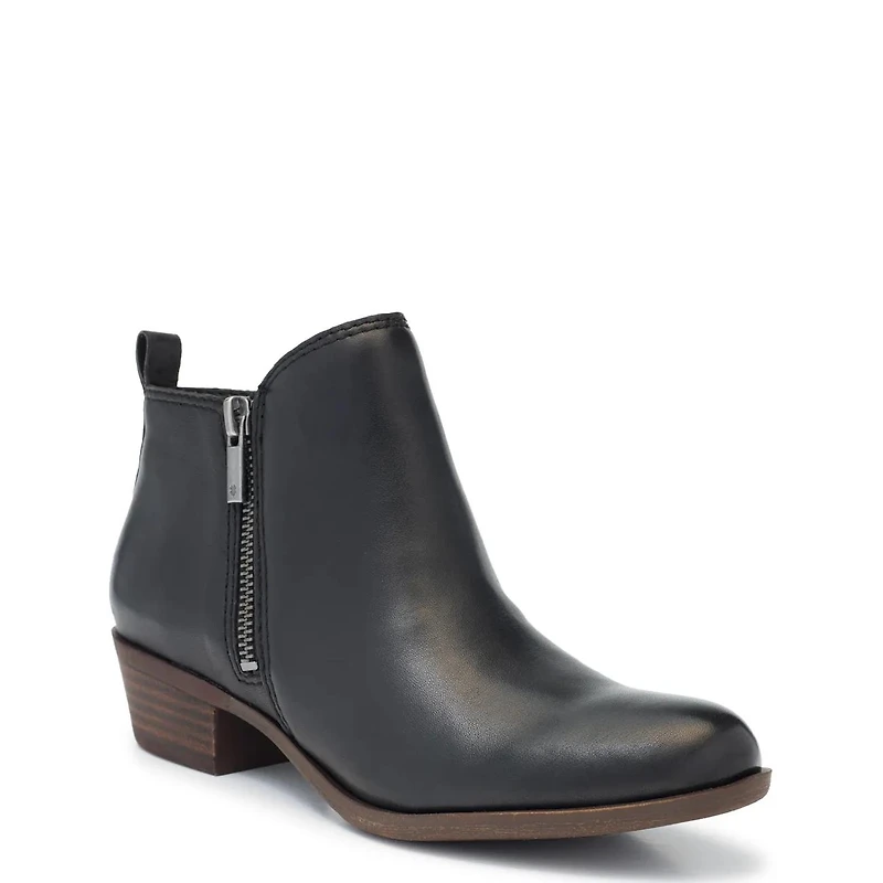 Step confidently in the women's Lucky Brand Basel black booties, crafted with a smooth leather upper that exudes timeless style. Featuring dual side zipper closures for easy wear and a flattering almond toe shape, these booties combine comfort and elegance. Inside, a textile lining and padded insole provide all-day cushioning, while the stacked block heel adds just the right amount of lift. Finished with a durable synthetic outsole, these booties are perfect for elevating any outfit with effortless charm.