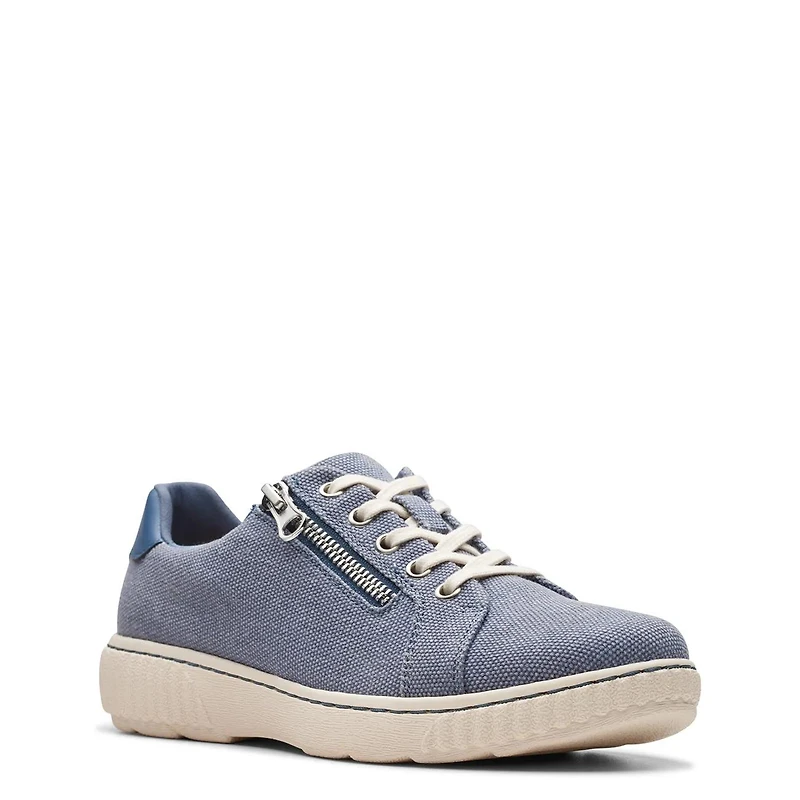 Step into crafted casual style with Clarks Caroline Echo denim blue, the sneaker to style with every dressed-down ensemble. Arriving in smooth leather and canvas for an elevated look and feel, this essential profile is topped with laces and a handy zip fastening for quick, easy foot entry. Stacks of comfort features make it a top pick too, like padding around the collar, 5mm Ultimate Comfort footbed and a slip-resistant thermoplastic rubber outsole.
