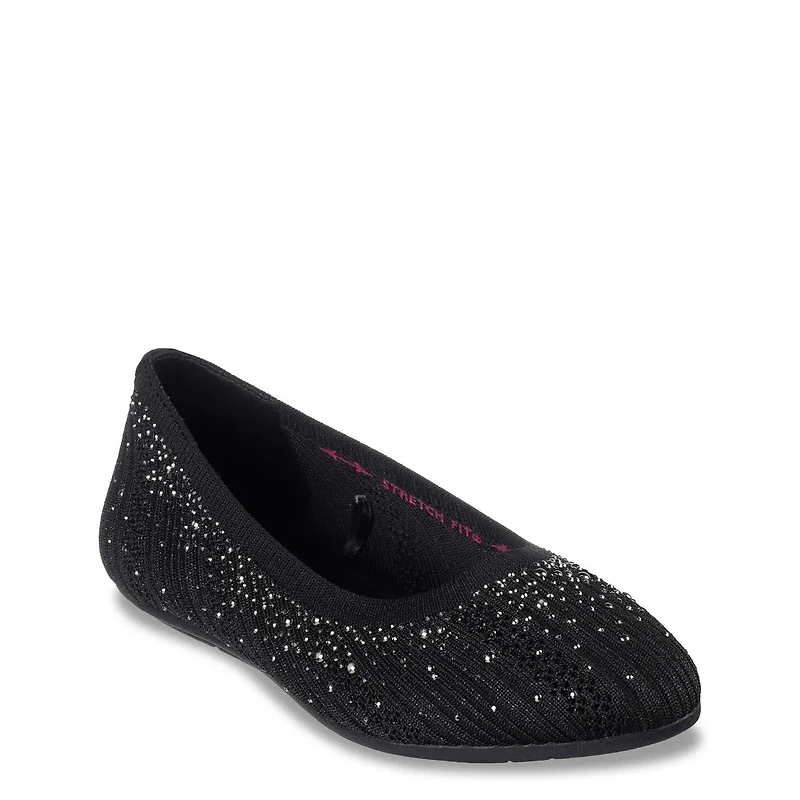The effortless elegance of the Skechers Cleo 2.0 Glitzy Daze Slip-in ballet flats for women features a sparkling knit upper adorned with rhinestones, these flats shine with every step. Made from 56% recycled and 100% vegan materials, they combine style with sustainability. Enjoy sock-like comfort from the Stretch Fit® design and plush cushioning with Skechers Air-Cooled Memory Foam®. The flexible EVA midsole and traction outsole ensure lightweight support all day long.