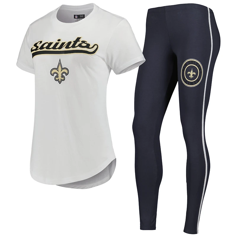 Feel like you're sleeping on a cloud with this cozy Concepts Sport Sonata set. It includes a top and leggings decked in New Orleans Saints graphics with complementing stripes that speak to your fandom. The classic tee construction and stretchy elastic waistband provide extra comfort as you dream of New Orleans Saints victories.