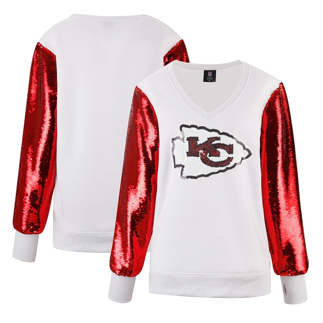 Women's Cuce White Kansas City Chiefs Sequin Sleeve V-Neck Pullover Sweatshirt