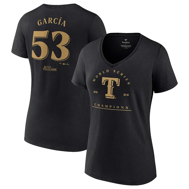 Women's Fanatics Adolis Garcia Black Texas Rangers 2023 World Series Champions Plus Name & Number V-Neck T-Shirt