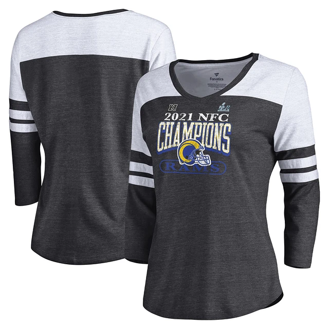 Women's Fanatics Heathered Charcoal Los Angeles Rams Super Bowl LVI Bound Classic Play Stripe 3/4-Sleeve Scoop Neck T-Shirt