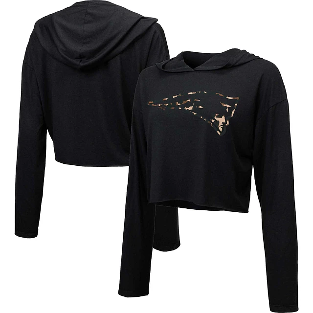 Women's Majestic Threads Black New England Patriots Leopard Cropped Pullover Hoodie