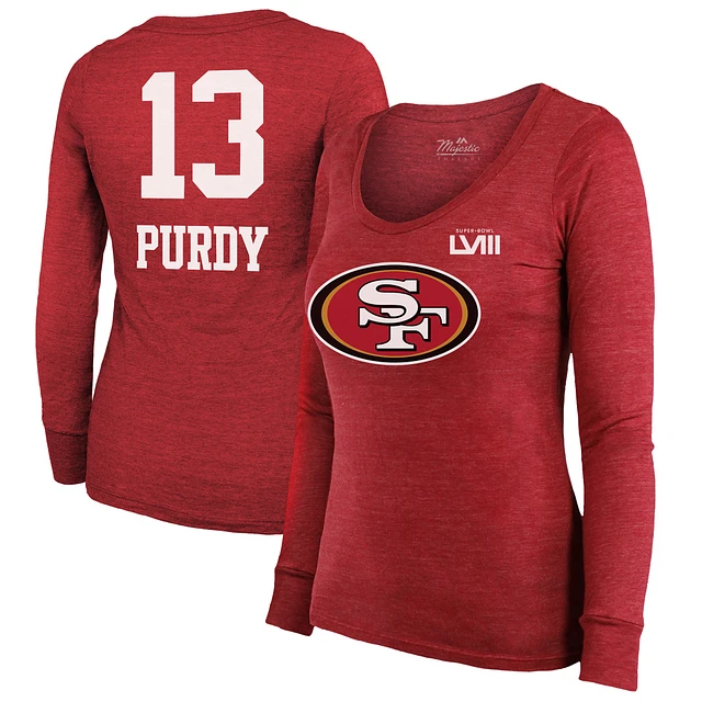 Women's Majestic Threads Brock Purdy Scarlet San Francisco 49ers Super Bowl LVIII Scoop Name & Number Tri-Blend Long Sleeve T-Shirt