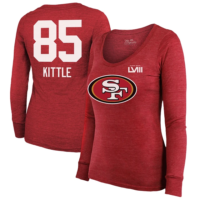 Women's Majestic Threads George Kittle Scarlet San Francisco 49ers Super Bowl LVIII Scoop Name & Number Tri-Blend Long Sleeve T-Shirt