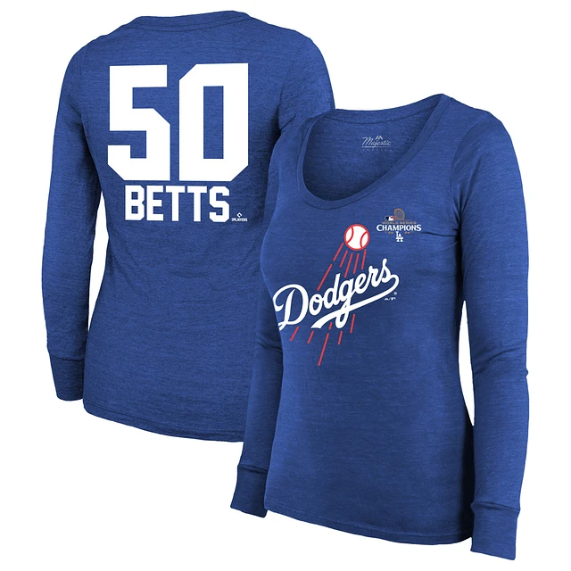 Women's Majestic Threads Mookie Betts Royal Los Angeles Dodgers 2024 World Series Champions Name & Number Tri-Blend Long Sleeve Scoop Neck T-Shirt