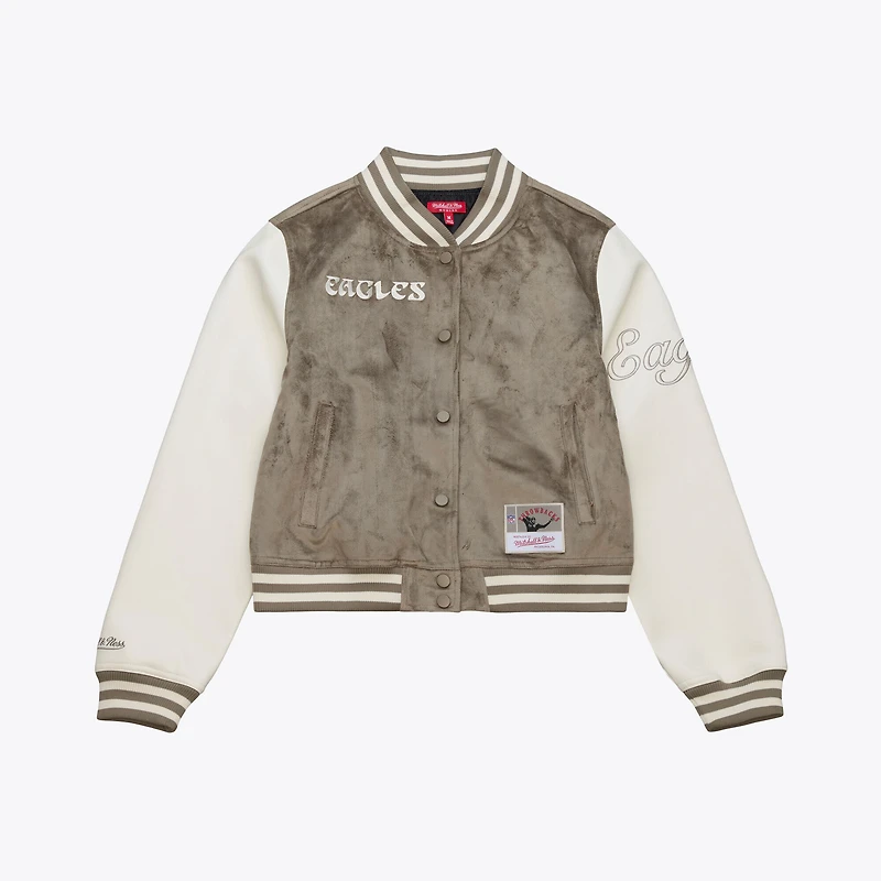 Show off your love for the Philadelphia Eagles with timeless style in this Full-Snap Varsity Jacket from Mitchell & Ness. Featuring smooth suede fabric with vintage-inspired graphics, this midweight jacket is built to protect you from the winter chill. The rib-knit details and side pockets combine for a durable and functional design, ensuring you stay comfortable and stylish while repping the Philadelphia Eagles all season long.