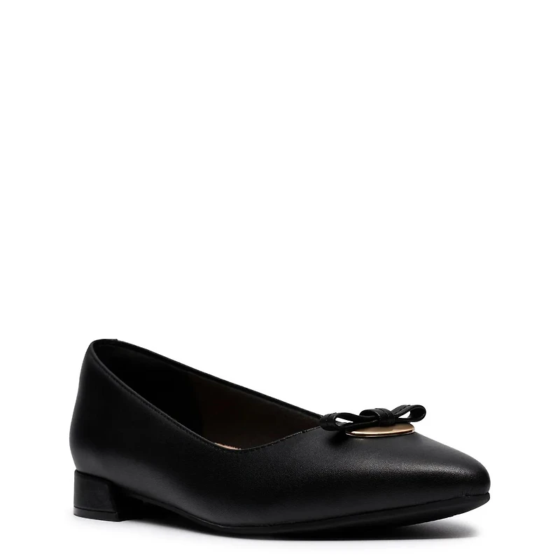 Timeless style meets everyday ease in these women's Clarks Natalyn Trim black low heel dress pumps. Boasting a durable leather upper, these pumps have a soft fabric lining for a smooth, breathable feel. A decorative bow with sleek gold-tone hardware adds a touch of sophistication, while the pointy toe keeps the silhouette classic. Engineered with Ultimate Comfort technology, the plush foam footbed cushions each step, and extra heel padding enhances all-day wearability. A grippy and flexible TPR outsole ensures reliable support.