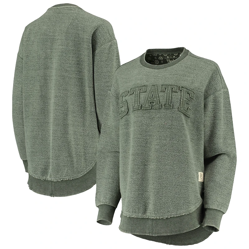 The Women's Pressbox Green Michigan State Spartans Ponchoville Pullover Sweatshirt is the perfect way to show your support for the Spartans. Made from a comfortable cotton and polyester blend, this midweight sweatshirt is perfect for moderate temperatures. The pullover design makes it easy to layer up or down, and the rounded droptail hem with raw edge adds a touch of style. Stitched fabric appliques with raw edge proudly display your Michigan State Spartans pride, and the washed-out fabric gives it a vintage look.
