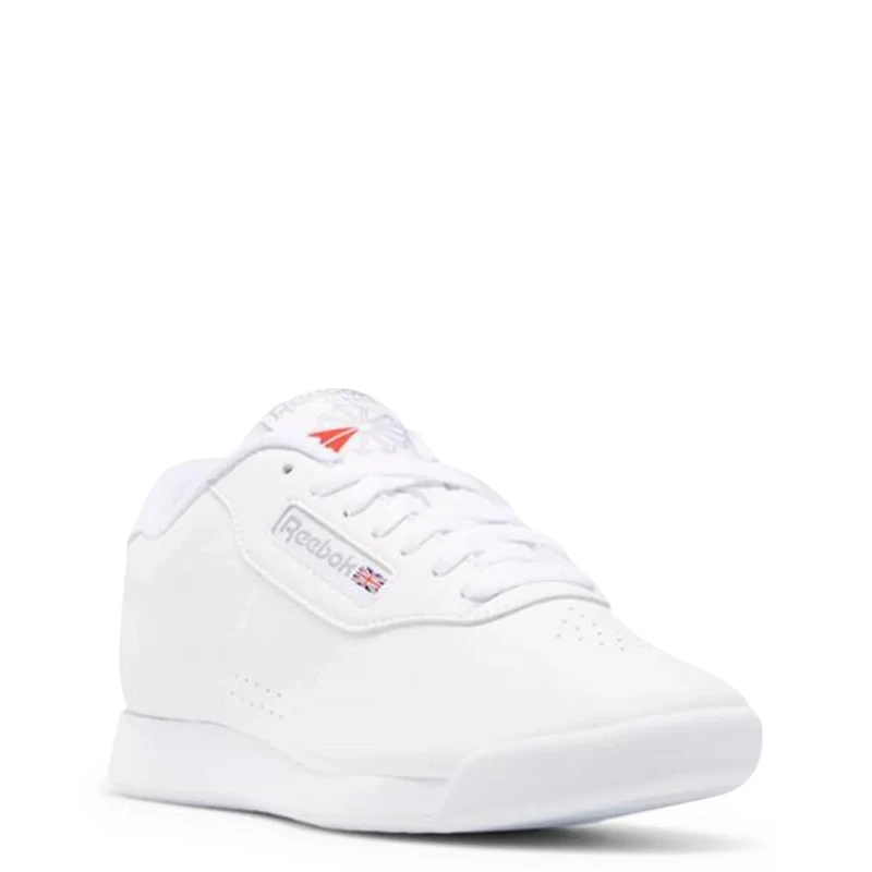 Enjoy the retro vibes and comfort of these women's Reebok Princess wide width white sneakers. Made with sleek synthetic upper with side perforations, these lifestyle shoes have a round toe and secure lace-up closure. Classic Union Jack logo adds a heritage vibe. The cushioned collar and tongue, padded foam sockliner, and an EVA cushioned midsole provide comfort and shock absorptio. A durable rubber outsole makes them a reliable choice. Savor the subtle style of this classic women's shoe.