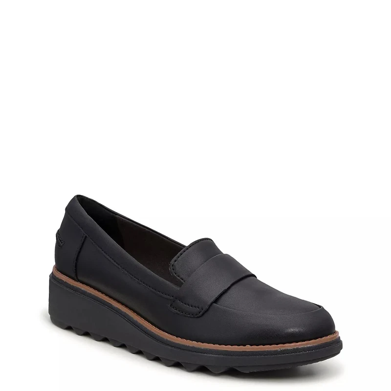 Blended with style and comfort, these women's Clarks Sharon Gracie black/tan penny loafers are a must-have for casual days around the town. Boasting of durable leather upper, these wedge slip-ons have a round toe front, smooth fabric lining, moisture-wicking OrthoLite® footbed with CushionSoft padding and a lightweight EVA outsole with traction-enhancing texture.
