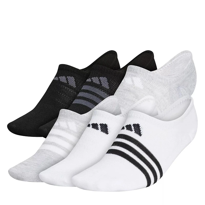 Enjoy the plush feel and support offered by these women's Adidas Superlite white/black 6-pack no show socks. Comprising mixed material construction, these socks feature no-show length, comfortable toe and heel and signature 3-Stripes design.