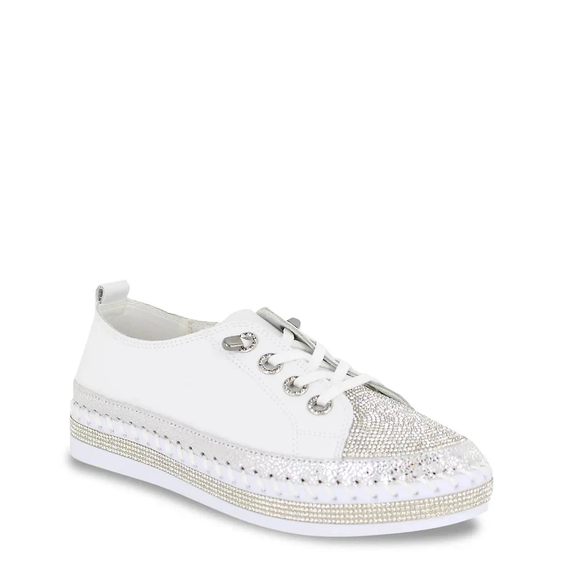 Step into a world of effortless elegance with the Women's TW Jodie Sneaker by Bernie Mev. Imagine your every step shimmering as the sumptuous leather upper dazzles with sparkling rhinestones. Feel the plush memory foam footbed cradles your feet in all-day comfort, while the sleek lace-up design ensures a perfect, secure fit. This sneaker is your stylish companion for every adventure, blending radiant charm with cozy support.